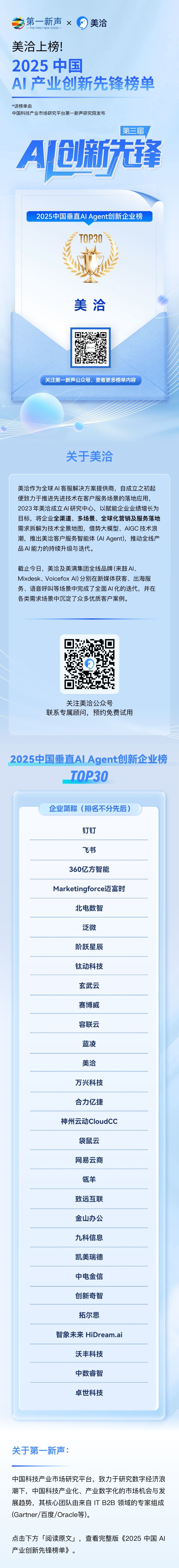 2025中国AI产业创新先锋榜单来了!美洽上榜! 美洽上榜——荣登2025中国垂直AI Agent创新企业榜TOP30 👏 Lily 2025年09月19日 品牌动态 Lily 美洽市场部:marketing@meiqia.com。各种商务合作欢迎来撩 首页 > 品牌动态 > 2025中国AI产业创新先锋榜单来了!美洽上榜!