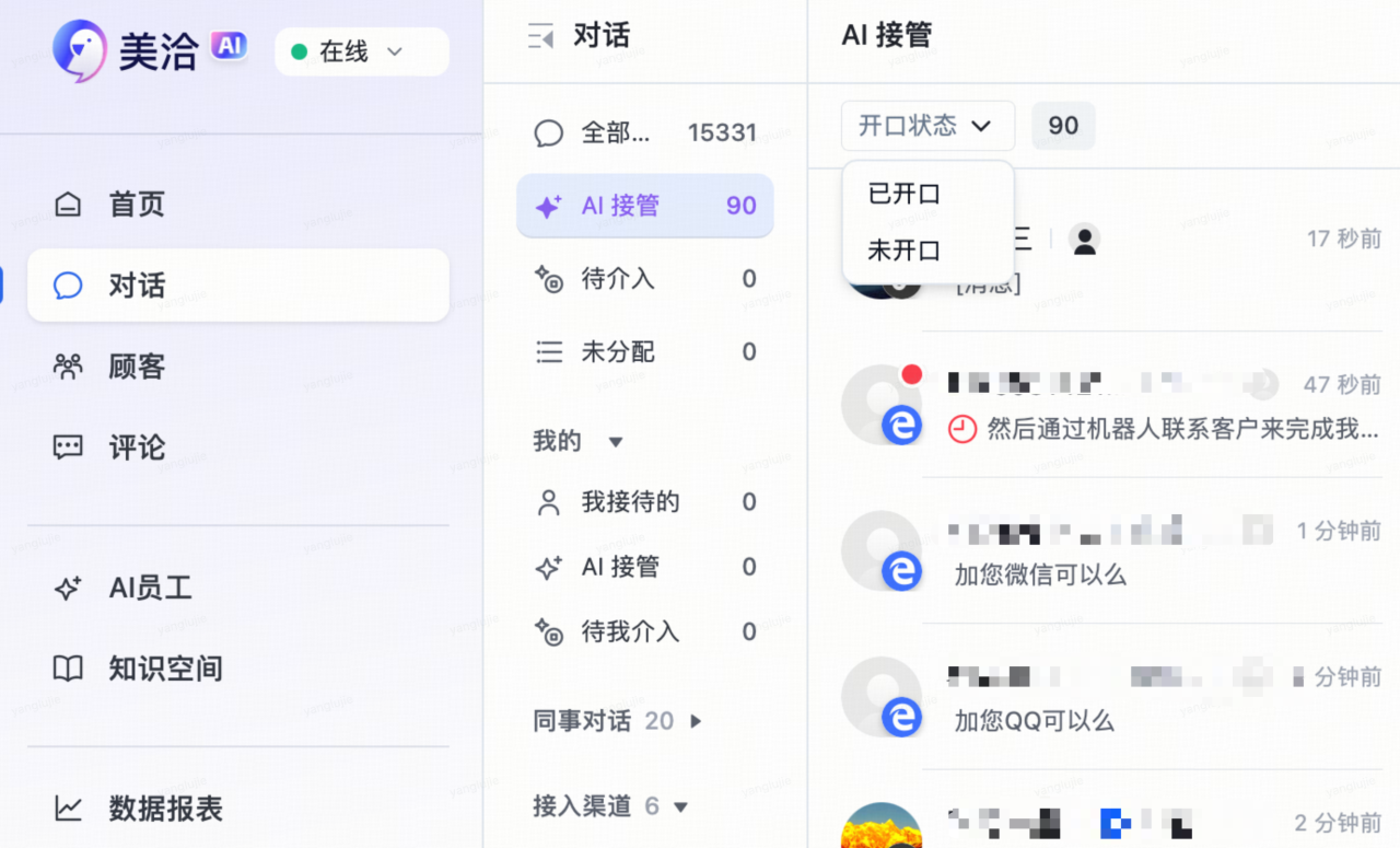 点击「AI接管」,可快速查看处理AI接管的对话。同时可在「开口状态」栏,快速筛选用户的开口情况。点击「待我介入」,可快速查看因为客户情绪切换为人工接管的对话(AI员工根据消息内容智能检测客户情绪,若客户情绪不佳,AI员工自动退出对话,切换为人工接管)。