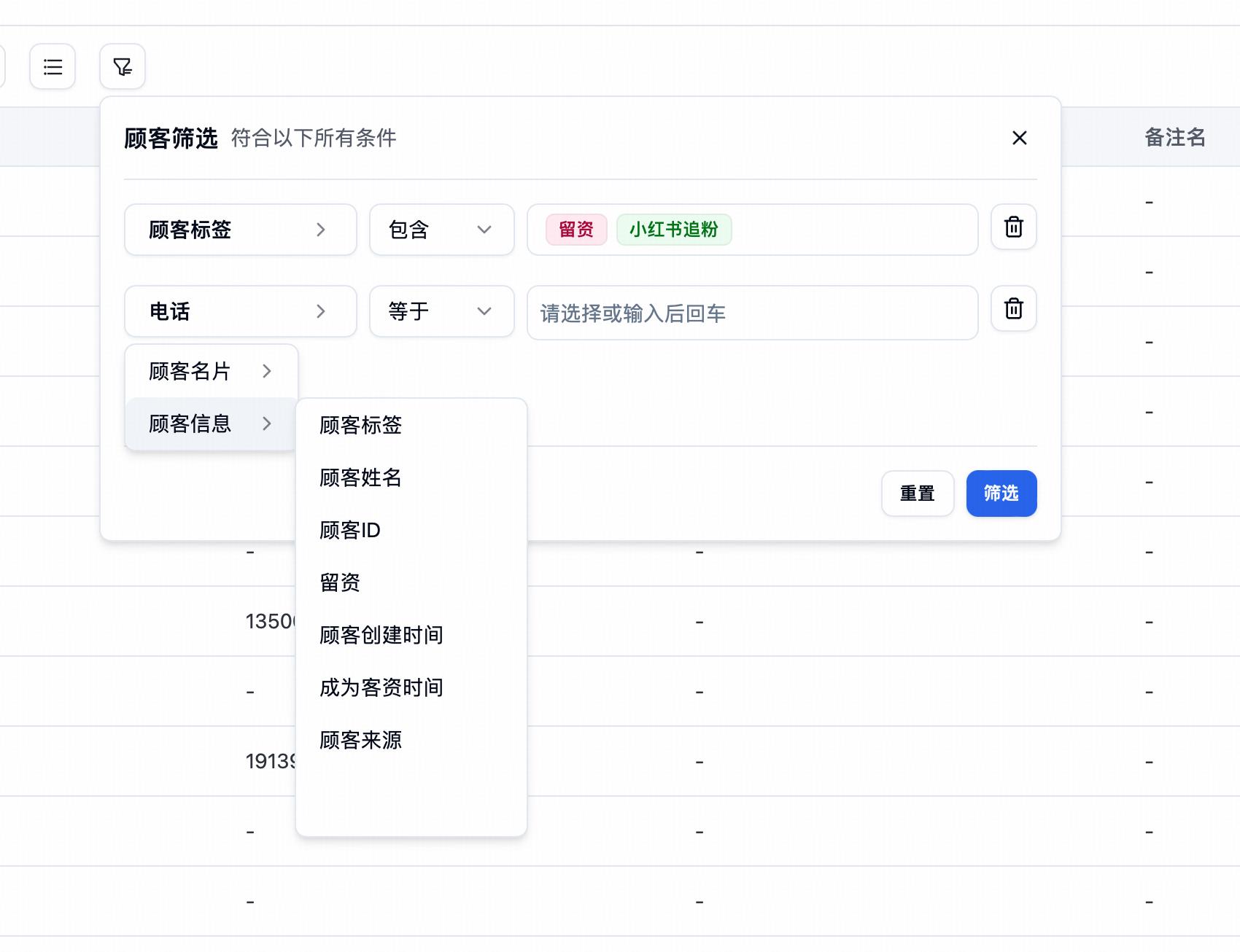 按照需求筛选顾客,并导出完整客户信息清单。有效提升客户按条件分类查询及客资管理效率。