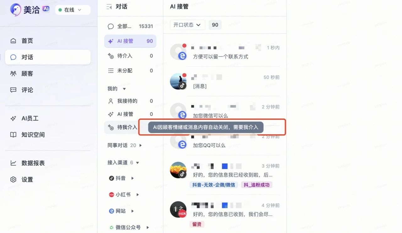 在对话板块中,新增展示「AI接管」和「待我介入」两种对话类型