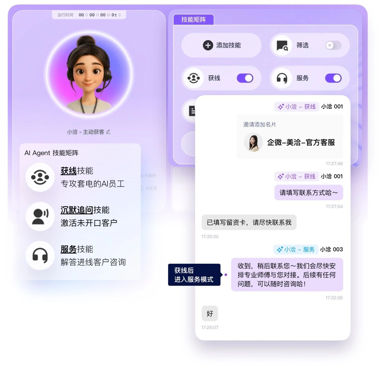- 意图分流与转接: 智能识别高意向、低意向和售后意图,将高意向客户优先转接给人工,将售后问题转给售后专员。