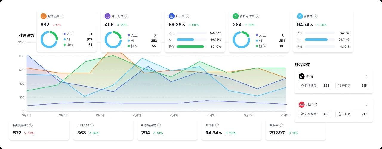 接入多个渠道,数据一目了然。对话数、开口数、留资数、留资率等关键数据指标,实时更新,支持一键导出深度分析。广告效果数据看板,准确反馈各渠道广告投放效果,反哺后续新媒体渠道投流策略。