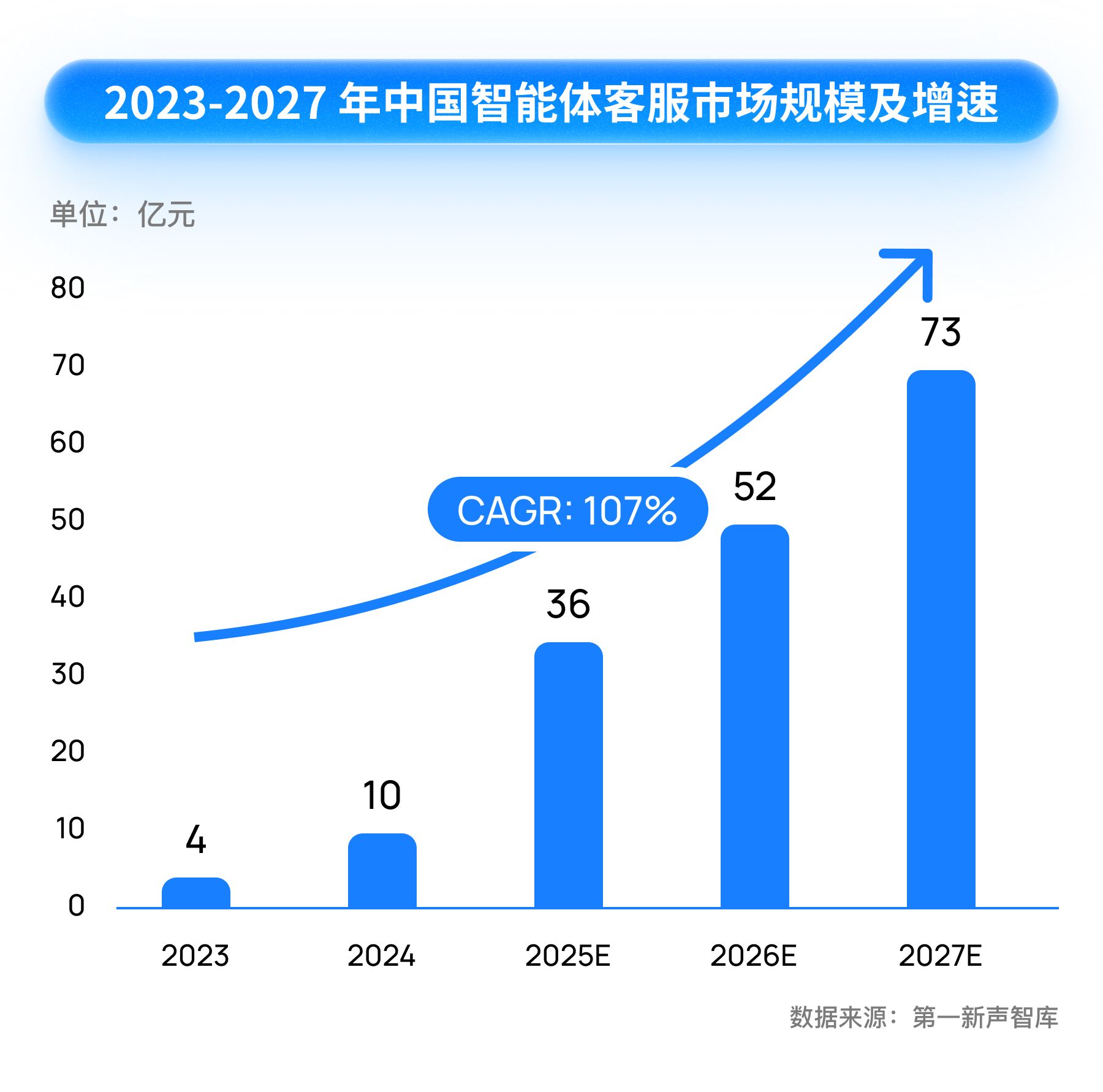 据第一新声智库研究,2023-2027年中国智能体客服市场规模复合增长率将达到107%;至2027年,企业级智能体客服市场规模将达到73亿元。