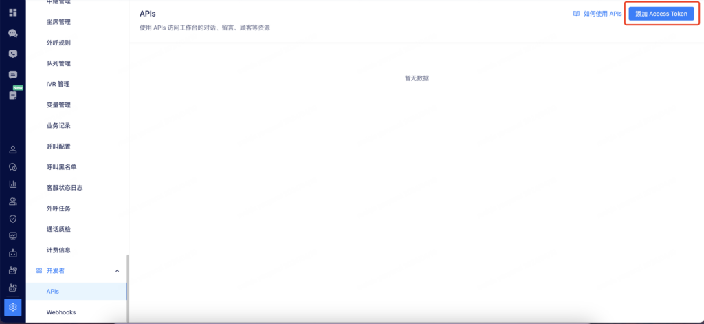 Access Token 您需要在美洽工作台【设置 / 开发者 / APIs】中创建获取。目前 Token 的有效期是永久,重复获取将导致上次获取的 Token 失效。