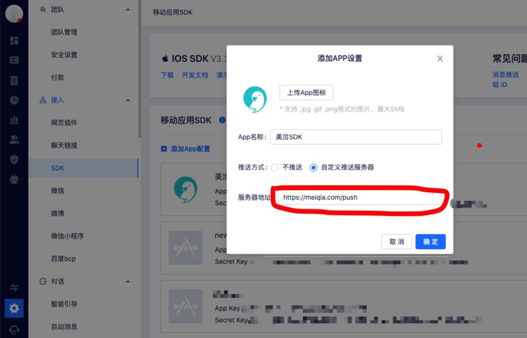 设置服务器地址,请使用美洽管理员帐号登录 美洽,在「设置」 -> 「SDK」中设置。